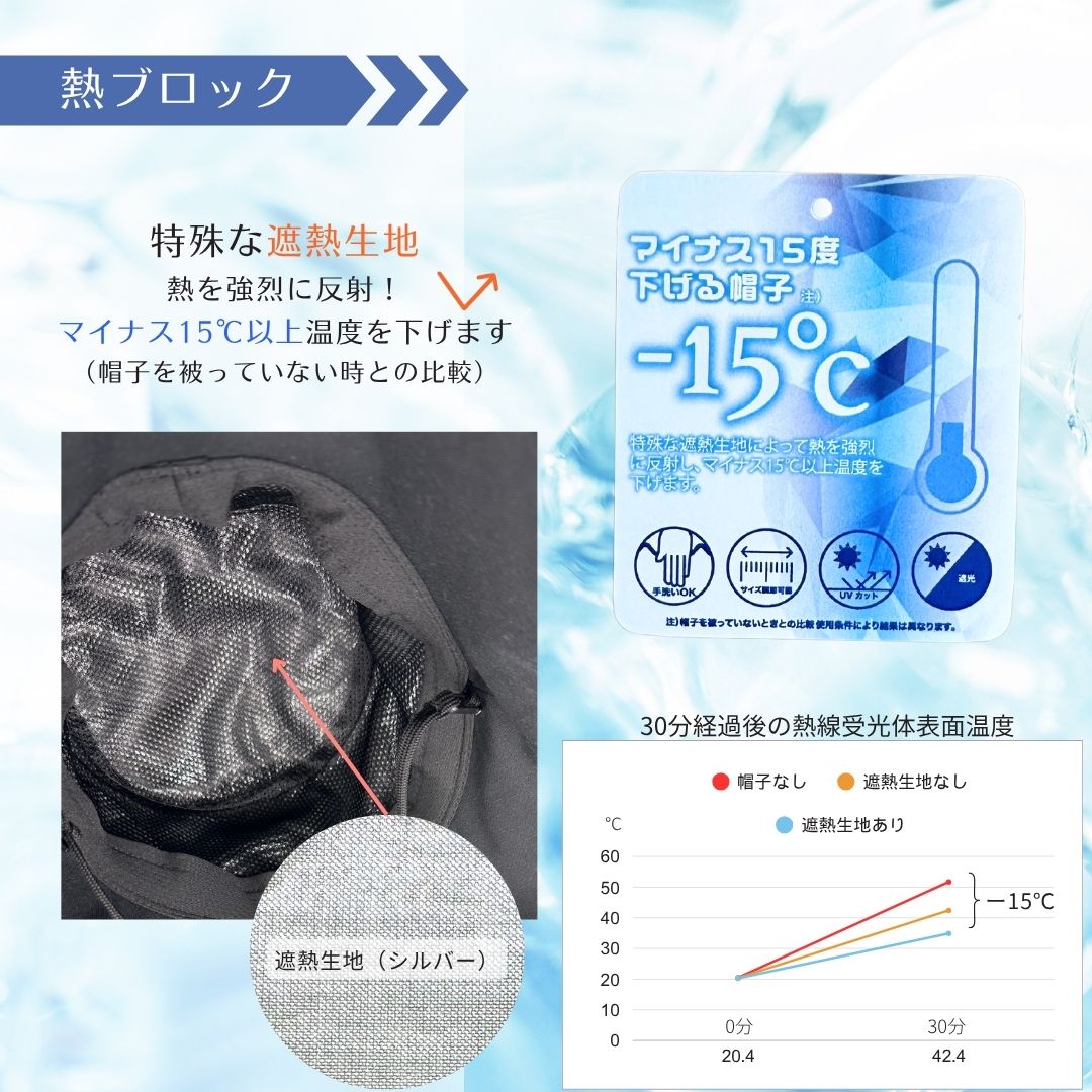 この帽子は特殊な遮熱技術を採用しており、帽子を被ってない時と比べ最大-15℃を実現。