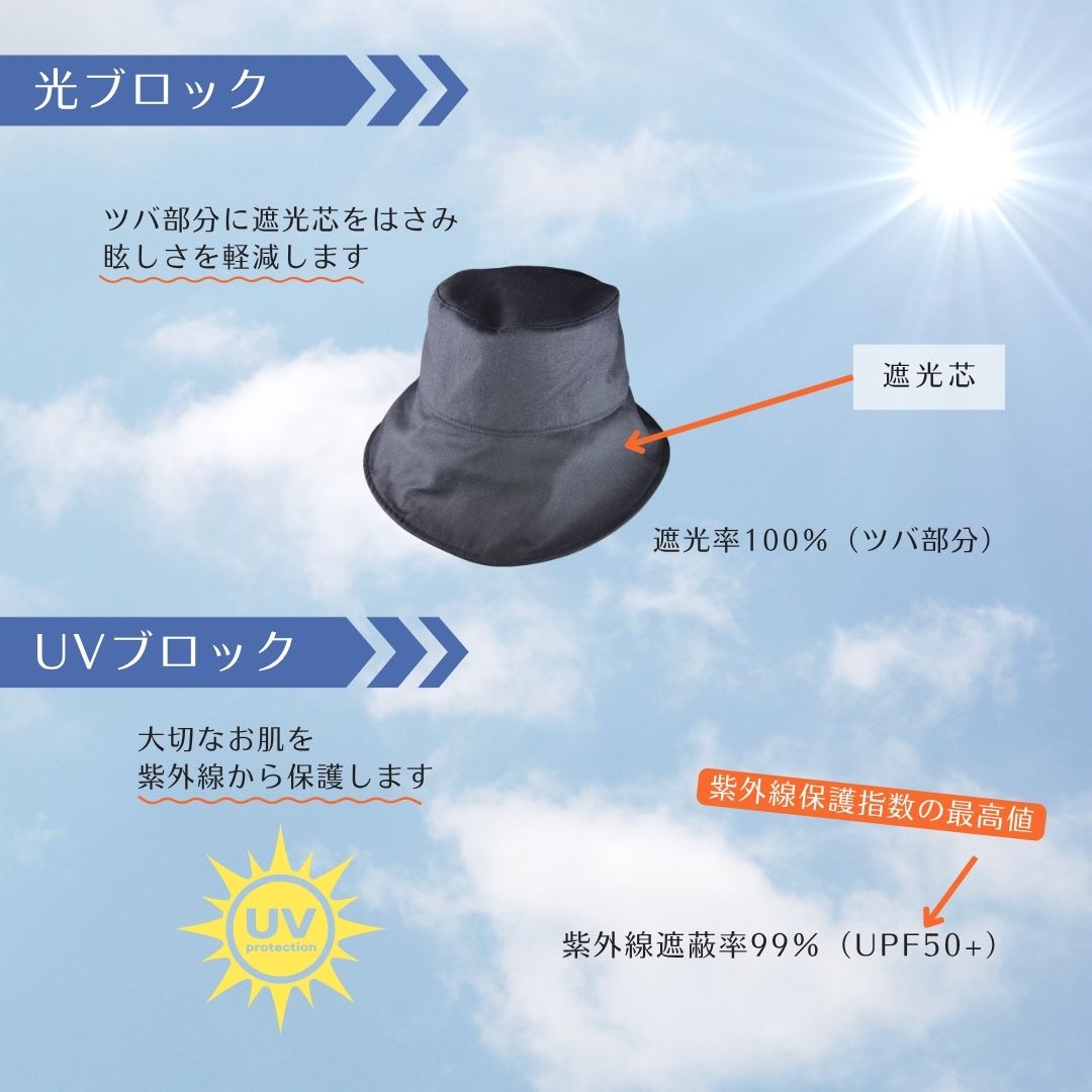 ◎ この帽子は、特殊な遮光芯を広いつば部に採用しており、眩しさや日焼けを防ぎます