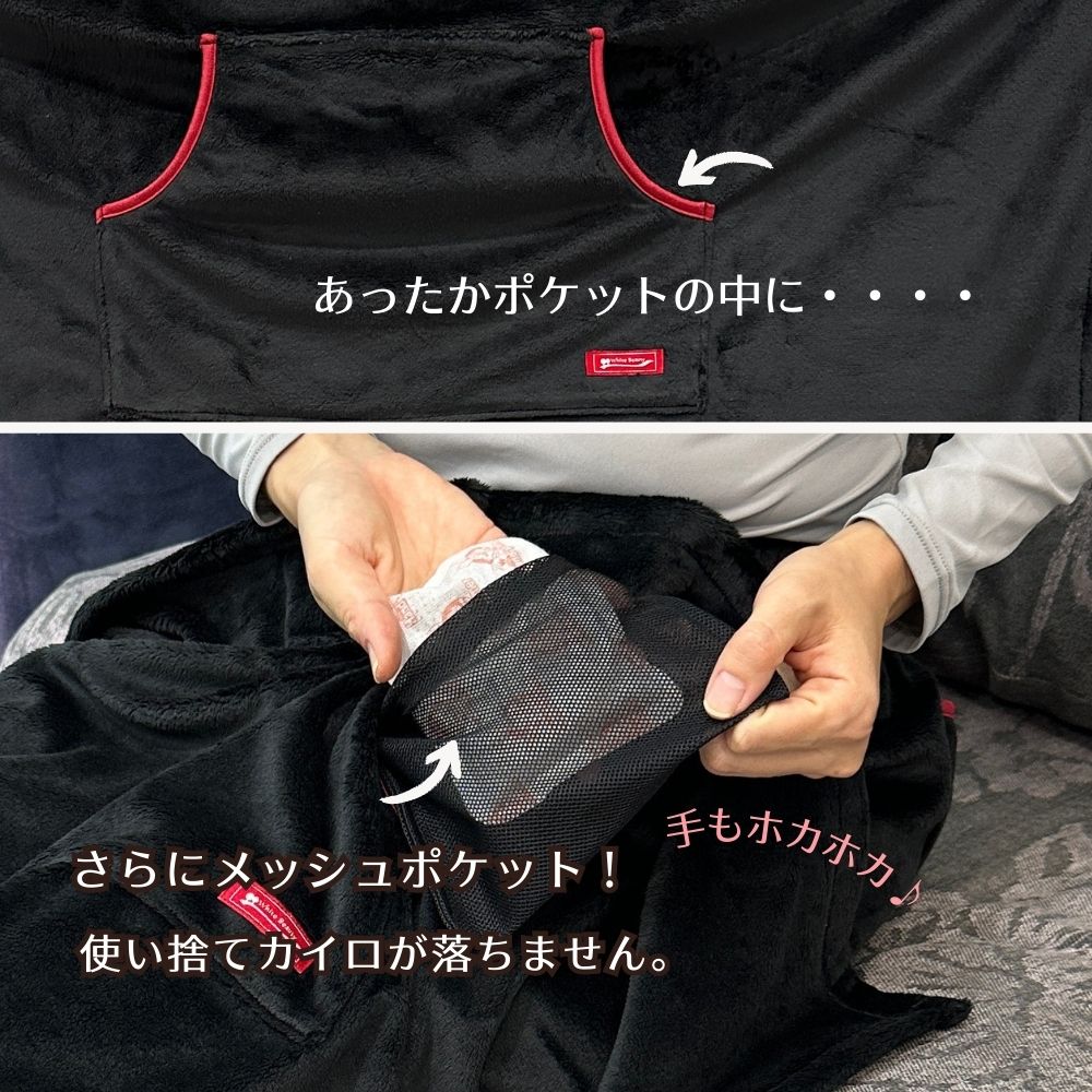 ・ひざ掛けに手を入れるポケットがついて手や脚を保温できる